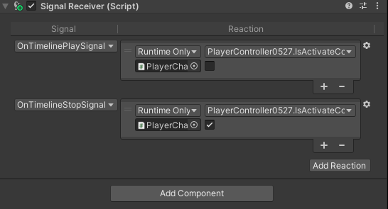 시그널 트랙은 시그널을 설정하여 해당 시그널에 반응할 메서드를 등록하여 마치 이벤트처럼 활용할 수 있다. 예를 들어 타임라인 맨 앞에 생성한 시그널에는 PlayerController
