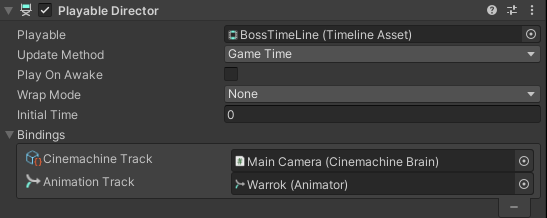 타임라인을 생성한 오브젝트를 선택하면 인스펙터 창에 Playable Director가 추가된 것을 확인할 수 있는데 Timeline에서 생성한 track이 Bindings에 업데이트된 것을 확인할 수 있다.