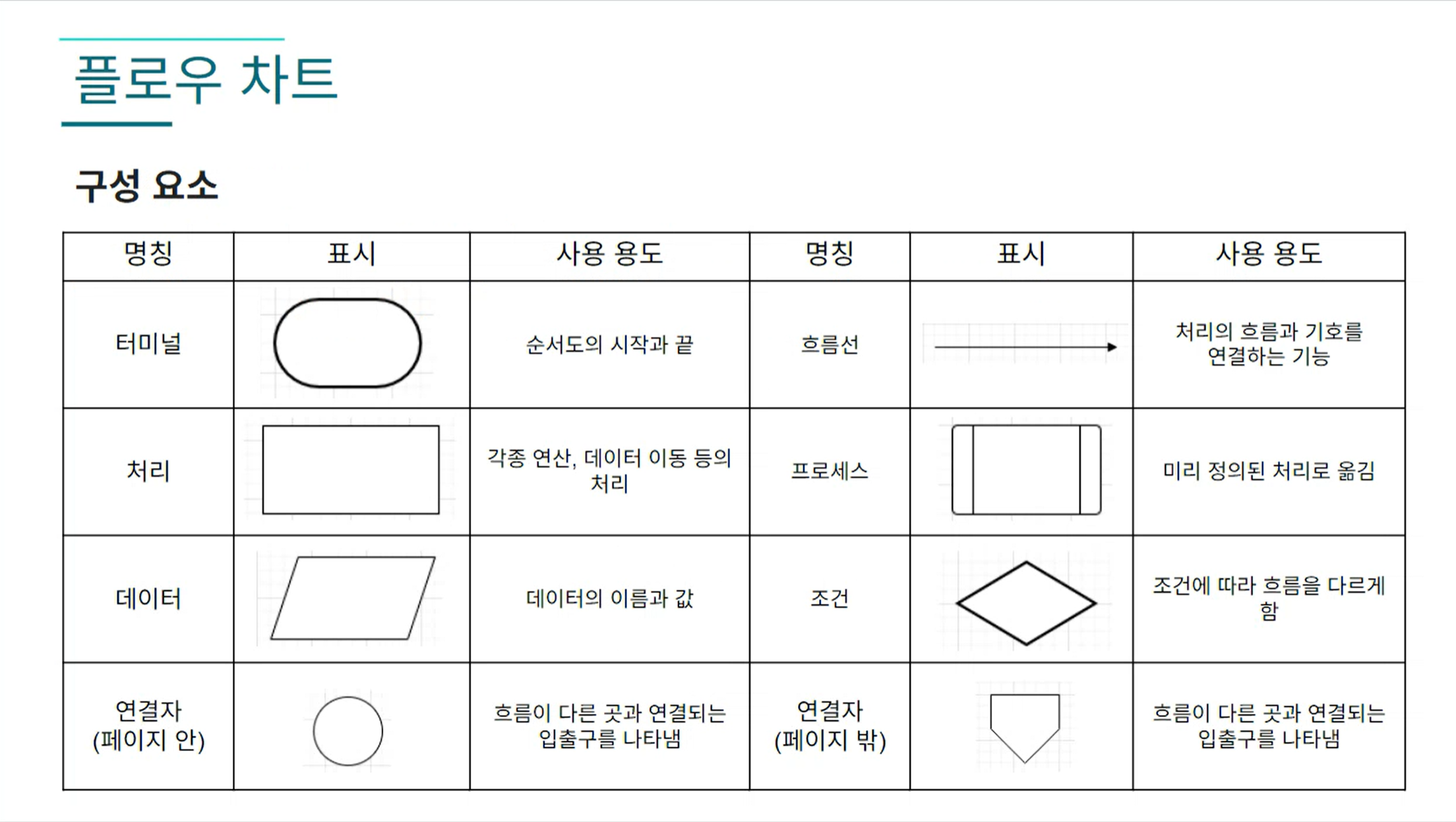 플로우 차트는 순서도, 흐름도라고도 하며, 어떠한 일을 처리하는 과정을 순서대로 간단한 기호와 도형으로 도식화한 것을 의미한다. 미리 정의된 기호와 연결선으로 알고리즘이나 프로그램의 논리 혹은 흐름을 그림으로 표현하는 방법이다.