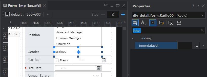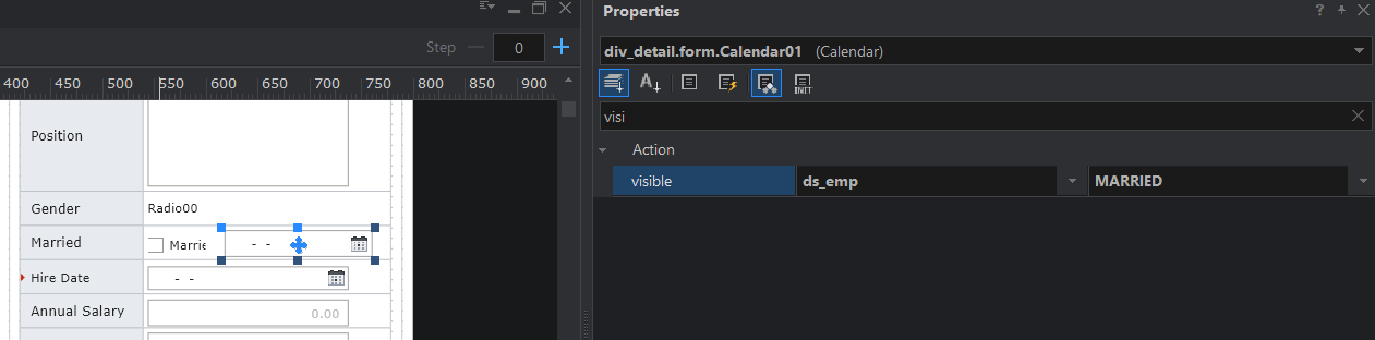 캘린더 컴포넌트의 visible 속성에 ds_emp 테이블의 MARRIED 컬럼과 바인딩을 걸었음.