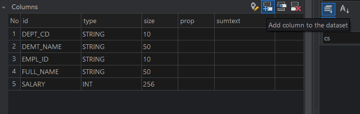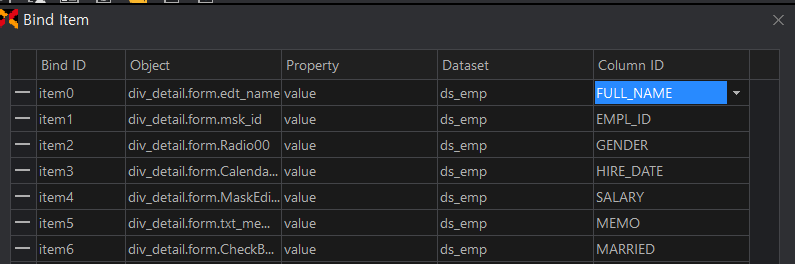 Dataset에 있는 컬럼 정보가 바인딩되어 Grid로 표현됨