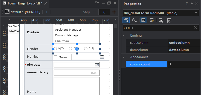 그리고 radio 컴포넌트의 프로퍼티 중 columncount를 3으로 바꿔줌