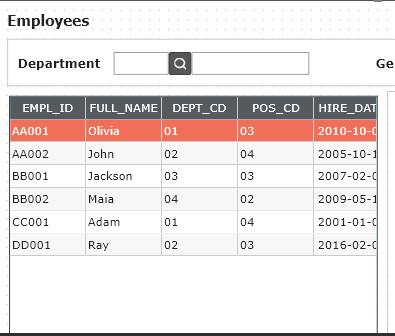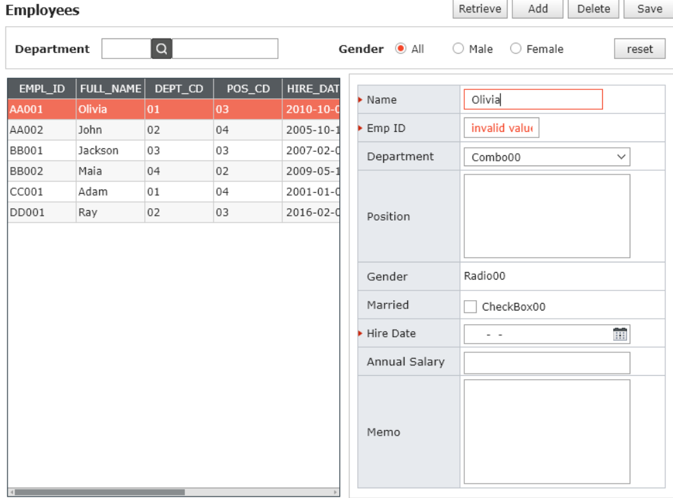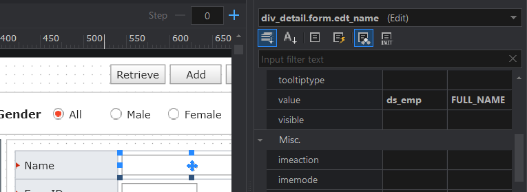 컴포넌트는 데이터셋에서 선택된 행(Row)의 값을 표시하거나 수정할 수 있음