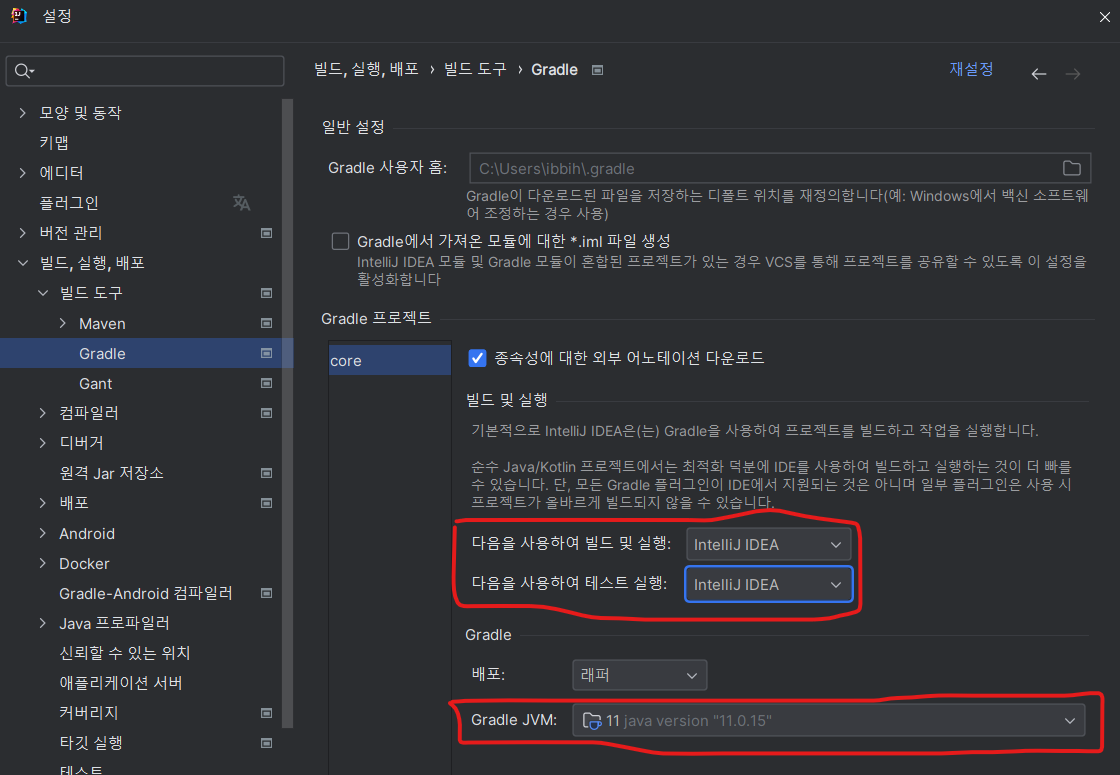 파일 → 설정 → 빌드 → 빌드도구 → Gradle → Gradle 프로젝트 → 다음을 사용하여 빌드 및 실행: IntelliJ