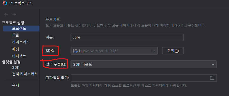 파일 → 프로젝트 구조 → sdk:java version 11 , 언어 수준: sdk default