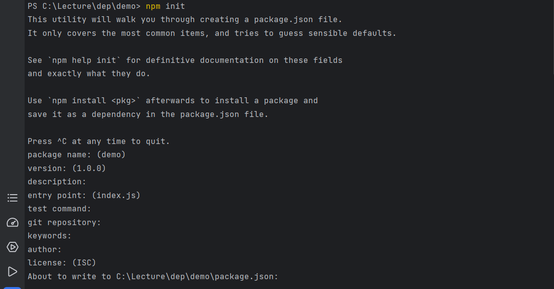 실행하면 package name, version .. 등등 터미널에서 입력하는 과정이 있는데 현재는 테스트용 서버 실행이 목적이기 때문에 엔터, 엔터만 연타해보도록 합니다.