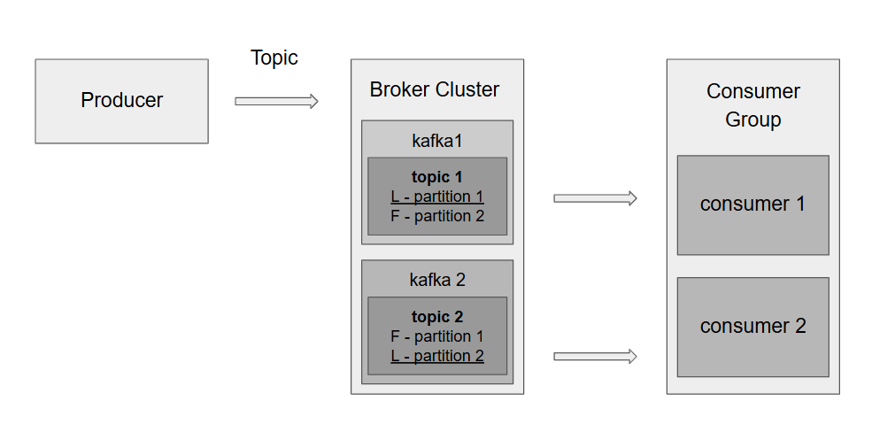 : 리더의 데이터를 복제(replication)하여 백업 역할을 수행한다. 장애 발생 시 리더 역할을 대신할 수 있다. kafka1은 partition1의 리더, kafka2는 partition2의 리더 역할을 하고 있다.