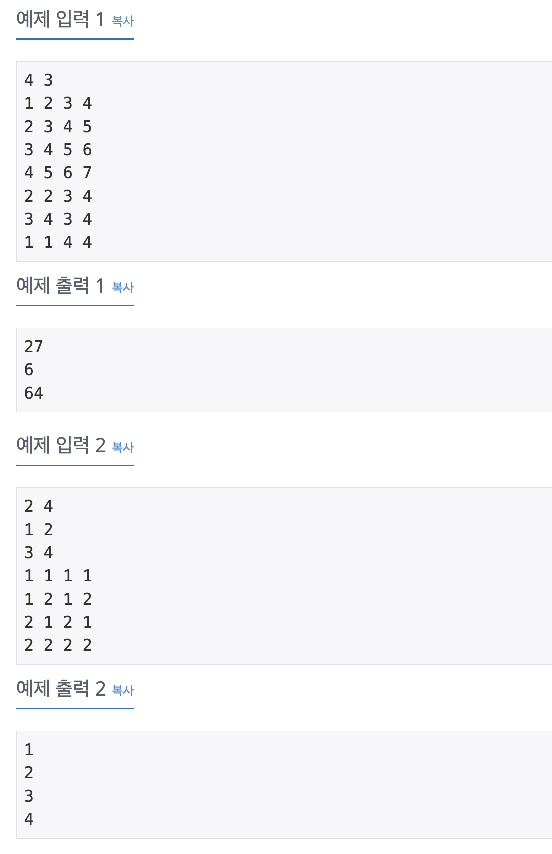 질의의 개수가 100,000이므로 질의마다 합을 구하면 안되고, 구간 합 배열을 이용해서 문제를 풀어야 한다. 구간 합 배열이 1차원에서 2차원으로 확장된 것으로 생각하여 구간 합 배열을 어떻게 구성할지 고민하는 것이 문제의 핵심이다.