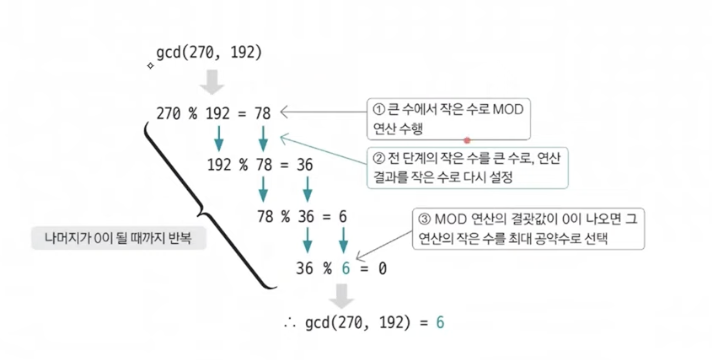 실제 유클리드 호제법을 구현할 때는 재귀함수를 사용한다.
