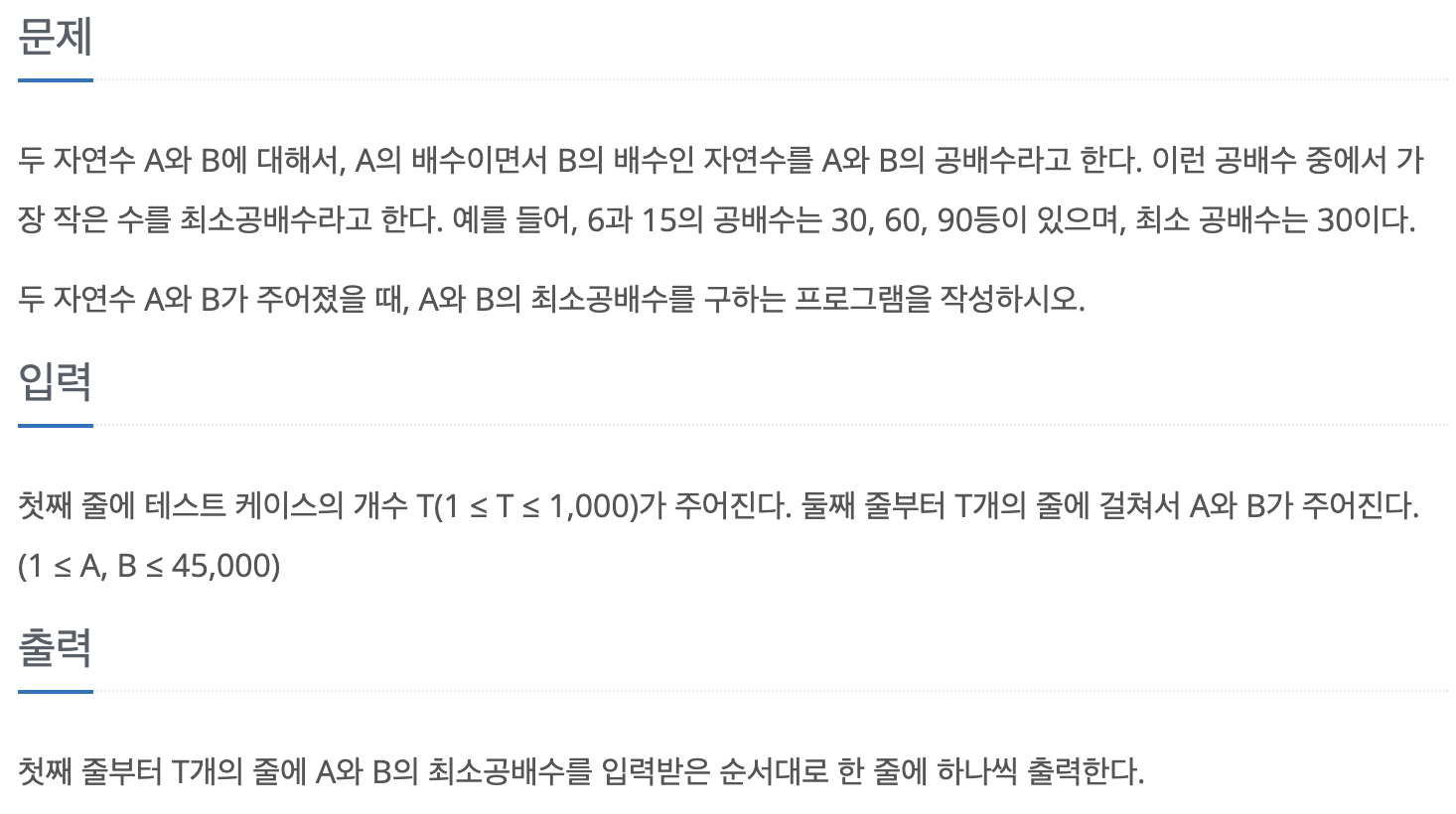 유클리드 호제법을 이용해서 두 수의 최대 공약수를 구하고 두 수를 곱한 값을 최대 공약수로 나누면 최소 공배수가 된다는 원리를 이용하는 문제이다.