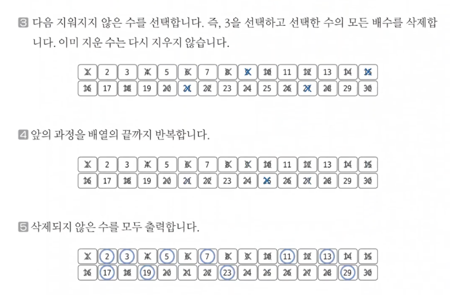예를 들어, 2의 배수를 삭제한 후 3의 배수를 삭제하면 2의 배수이자 3의 배수인 6, 12, ... 등은 2의 배수를 삭제하는 연산에서 이미 삭제된 값이므로 3의 배수를 삭제하는 연산 시 삭제가 생략된다.