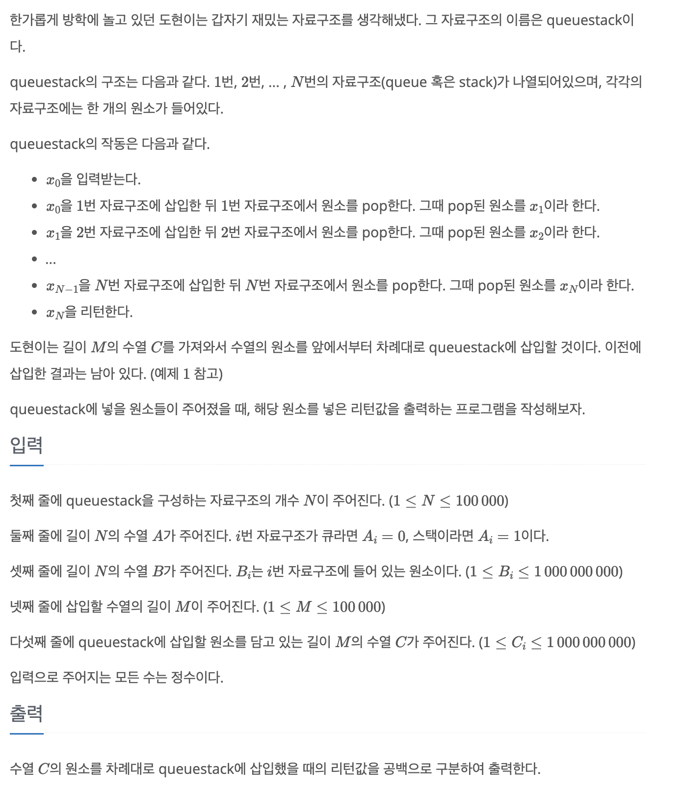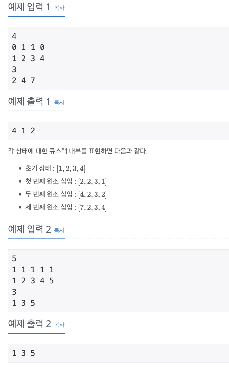 예제 입력 1을 예시로 풀이 아이디어를 설명하자면, queu는 선입후출, stack은 선입선출이기 때문에 사실상 stack에 append()로 들어간 데이터는 pop() 연산으로 나오게 되어 있어서 순서에 전혀 영향을 주지 않는다.