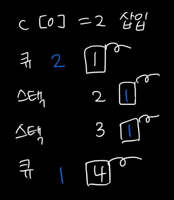 아래 이미지를 보면 파란색 숫자가 삽입된 데이터, 흰 숫자가 자료구조에 들어있는 초기값 즉,B[i]이다. stack에 들어간 데이터는 그대로 나오지만, queu는 데이터가 앞으로 들어가고(appendleft()) 나가는 건 마지막 데이터가 나가기 때문에(pop()) 순서에 영향을 주게 된다.
