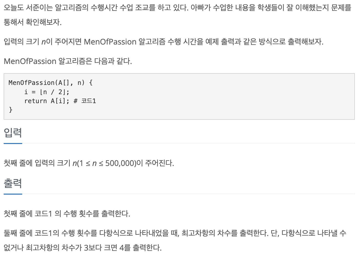 MenOfPassion 알고리즘은 한번의 연산 후 return이 이루어지므로 수행 횟수는 항상 1번이며 이를 다항식으로 나타내면 최고차항의 차수는 0이 된다.