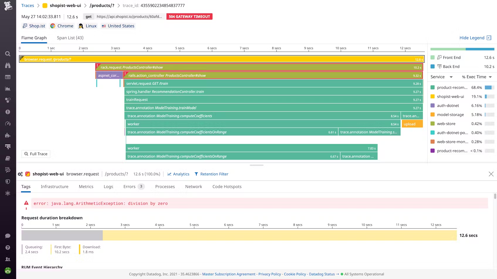 트레이싱은 APM (Application Performace Monitoring)툴들을 사용해보셨으면 본적이 있을겁니다. Elastic APM, DataDog, Sentry, NewRelic등 APM을 사용해보시면 이런 페이지를 보신적 있을겁니다.