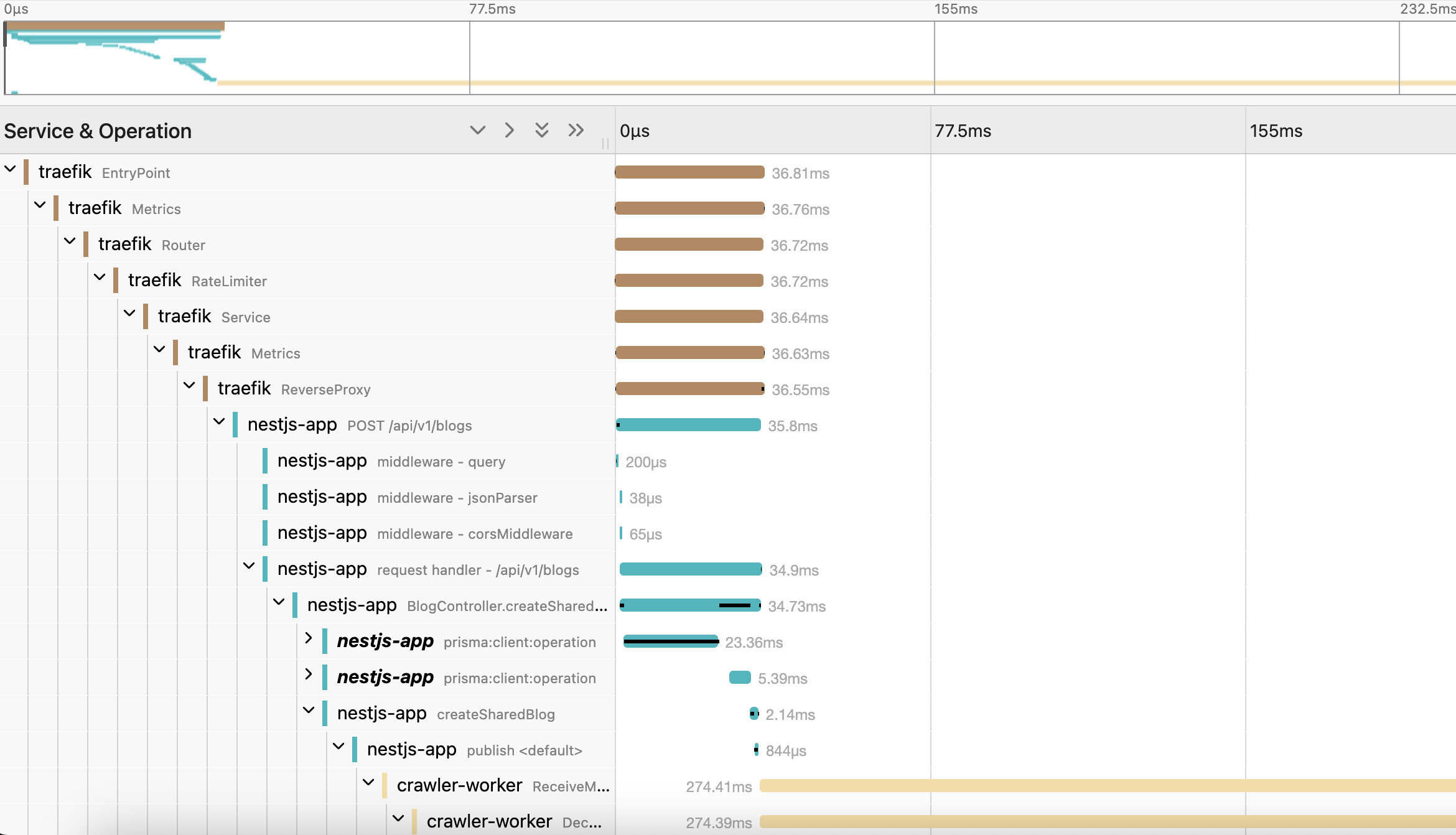 위 같이 아키텍처를 만들어서 사용을 해보니 아래와 같은 트레이싱 데이터가 잘 나오는걸 확인 했습니다.