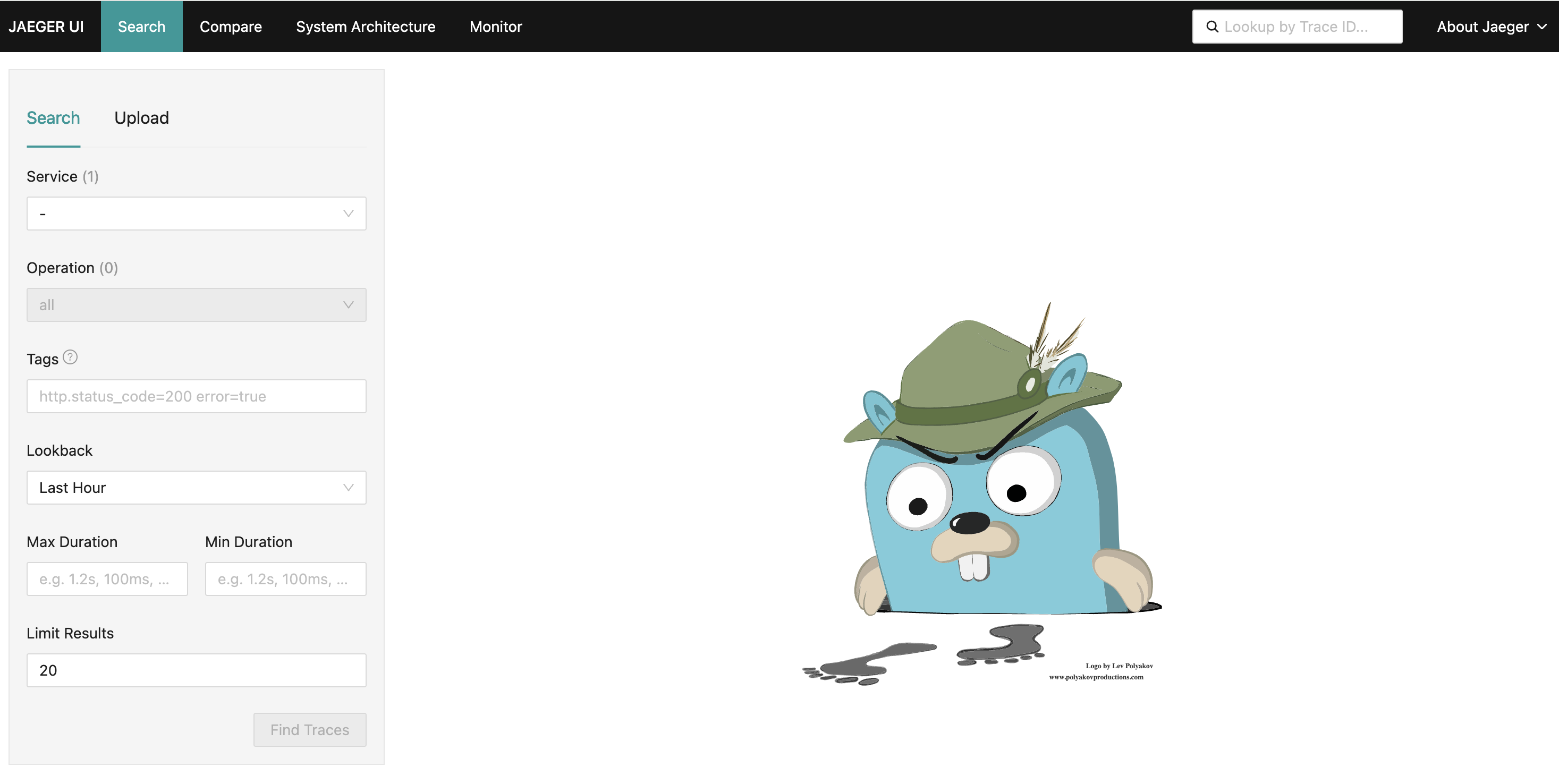 결과를 보고싶으면 Grafana에 Jaeger를 추가해서 보셔도 되고 그냥 localhost:16686을 들어가서 확인 해도 됩니다. 16686은 예거 UI 포트번호 입니다.