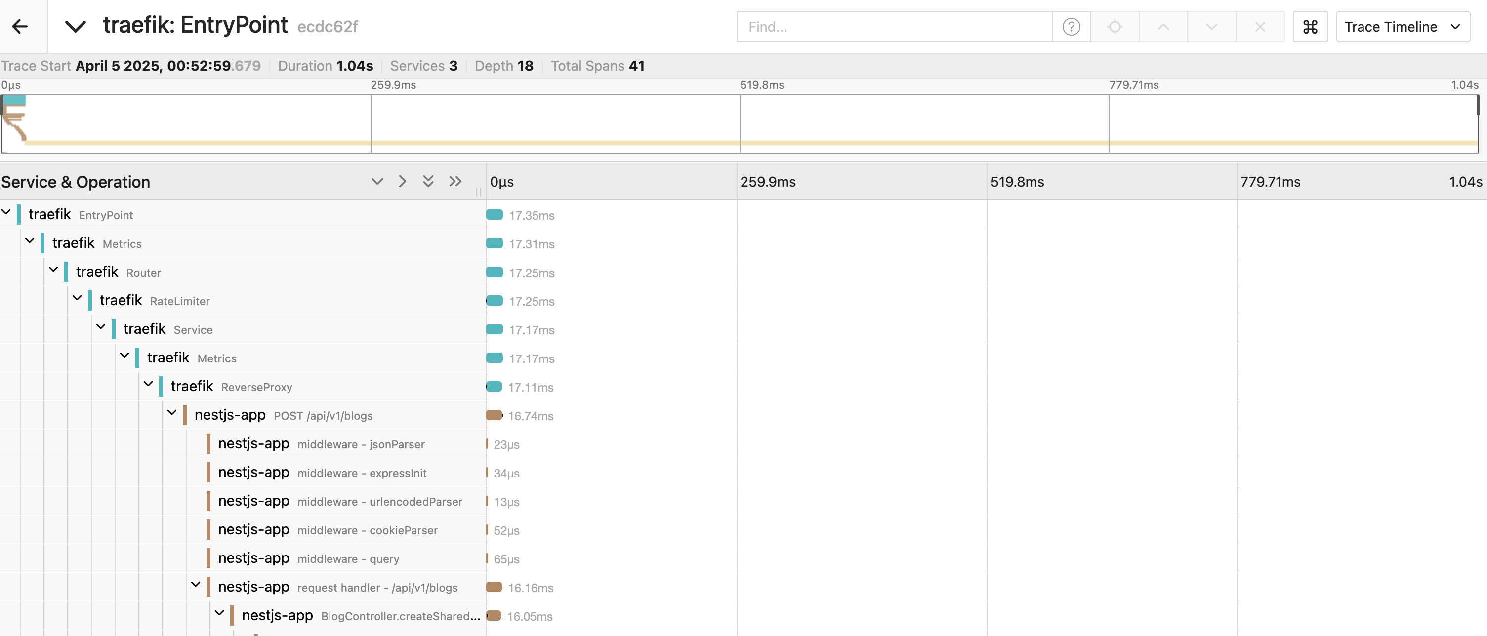 잘 된거를 확인 할수 있습니다. traefik을 통해서 들어와서 nestjs-app을 들어오는데 미들웨어와 handler, controller 와 그 외 함수들을 거치고 Prisma를 통해서 쿼리가 어떻게 나가는지도 잘 보이는걸 확인할수있습니다.