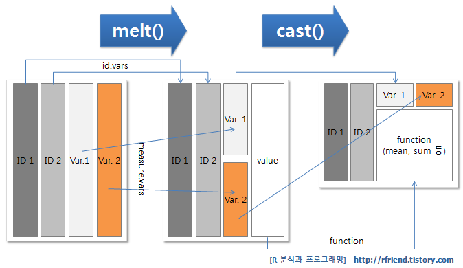 apply 함수에 기반해 데이터와 변수를 동시에 배열로 치환 split -> apply -> combine 기능 제공, 즉 데이터 분할 -> 함수를 적용 -> 재결합