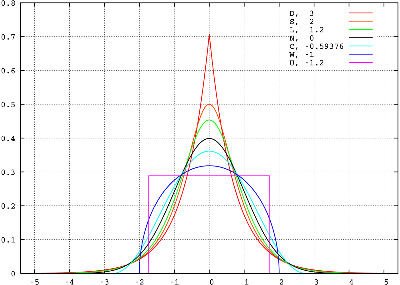 정규분포의 첨도는 0이다. (기본적인 정의에 의하면 3이지만, 일반적으로 정규분포의 첨도를 0으로 만들기 위해 3을빼서 정의하는 경우가 많다) 첨도가 0보다 크면 정규분포보다 긴 꼬리를 갖고, 분포가 보다 중앙부분에 덜 집중되게 되므로 중앙부분이 뾰족한 모양을 가지게 된다. 반대로 첨도가 0보다 작으면, 정규분포보다 짧은 꼬리를 갖고 분포가 중앙부분에 더 집중되어 중앙부분이 보다 완만한 모양을 가지게 된다.