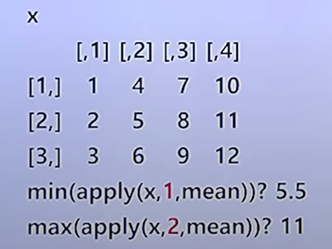 apply(x, margin, fun): margin 1이면 = '행', margin 2이면 = '열'