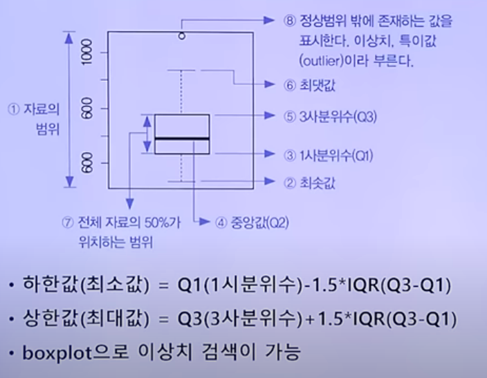 이상점은 다른 자료와는 극단적으로 다른 값, 상자그림에서 상(하)사분위수로부터 1.5xIQR[2] 만큼 떨어진 거리보다 더 먼 곳에서 발견되는 관측값으로 정의된다.