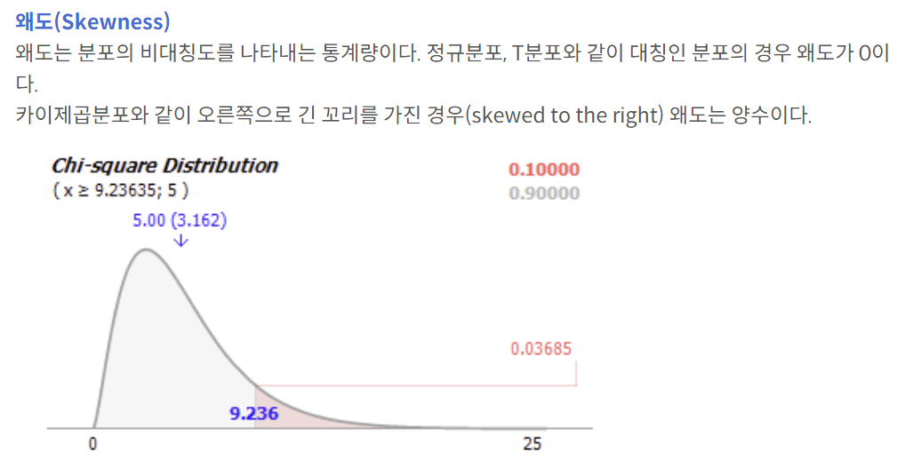 분포의 비대칭도를 나타내는 통계량이다. 정규분포, T분포와 같이 대칭인 분포의 경우 왜도가 0이다. 카이제곱분포와 같이 오른쪽으로 긴 꼬리를 가진 경우 왜도는 양수이다.