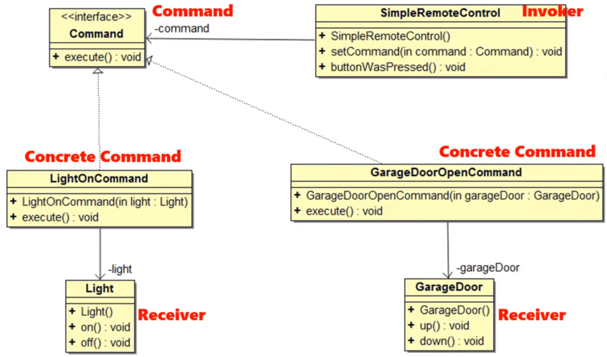 🚩 LightOnCommand, GarageDoorOpenCommand : 구상 클래스. 호출 시 각자의 리시버 Light, GarageDoor 가 호출되도록 함.