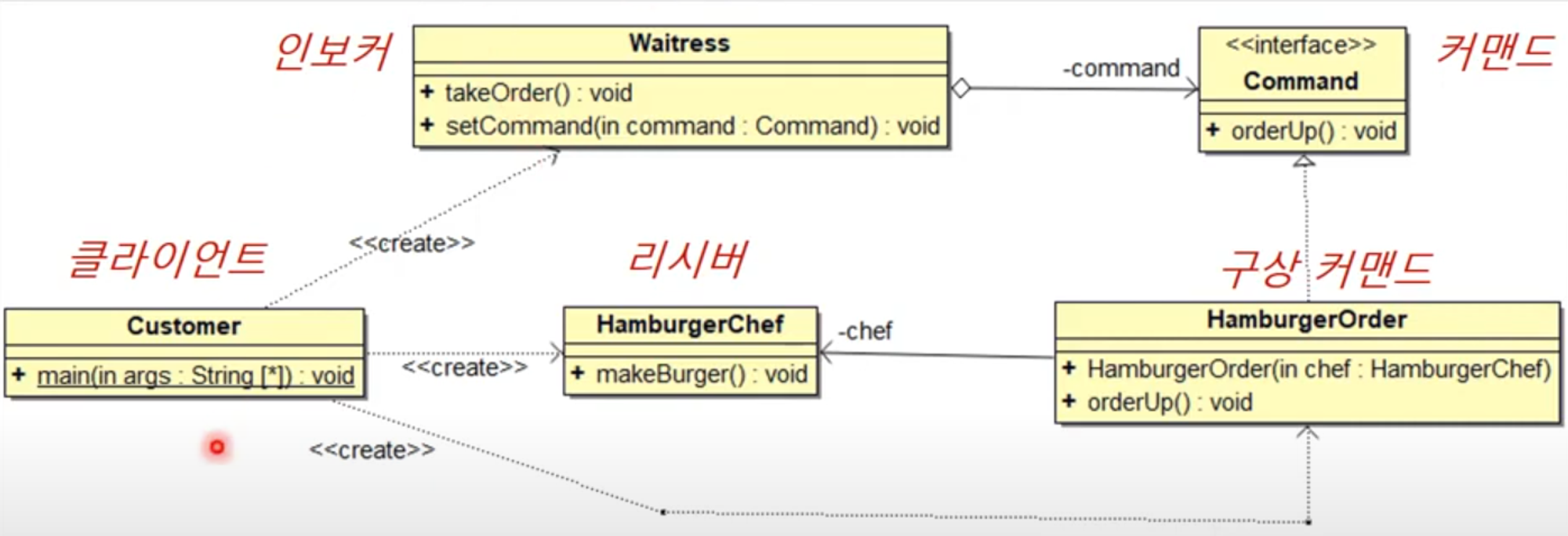 Command : 커맨드 인터페이스. 실행할 명령을 정의. ex) execute()HamburgerOrder : 구상커맨드. 리시버 객체를 알고 있으며, 명령을 실행할 때 리시버 객체의 메서드를 호출 (바인딩)HamburgerChef : 리시버. 실제 작업을 수행