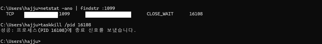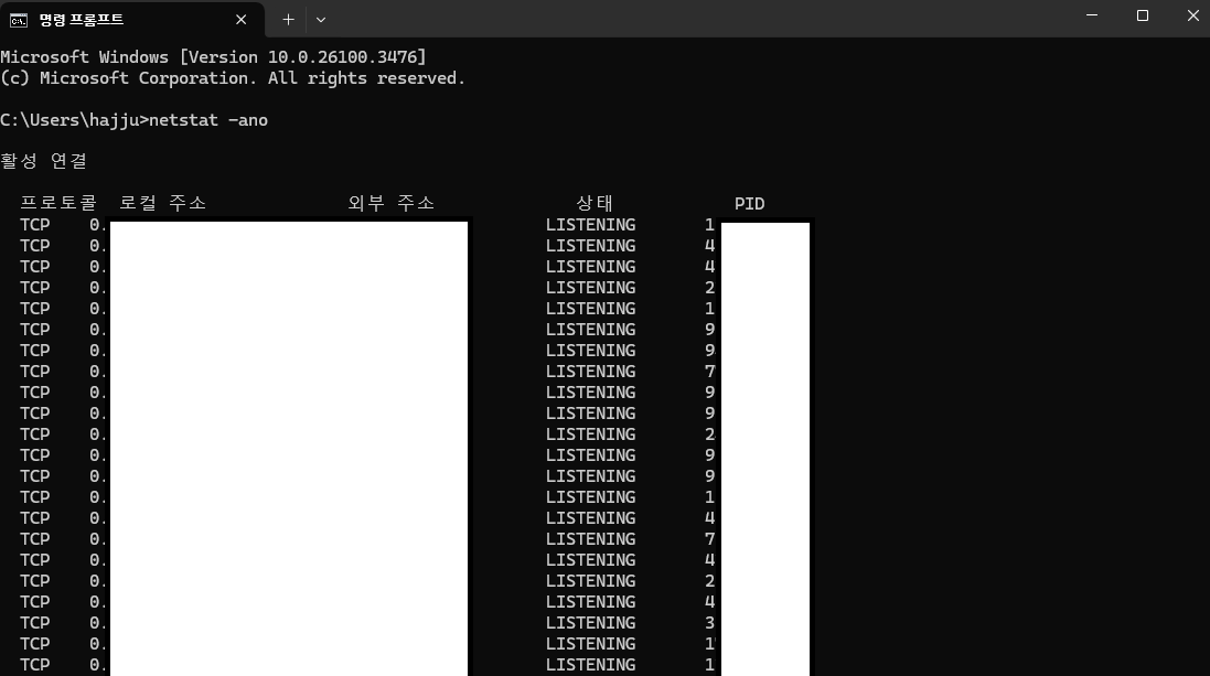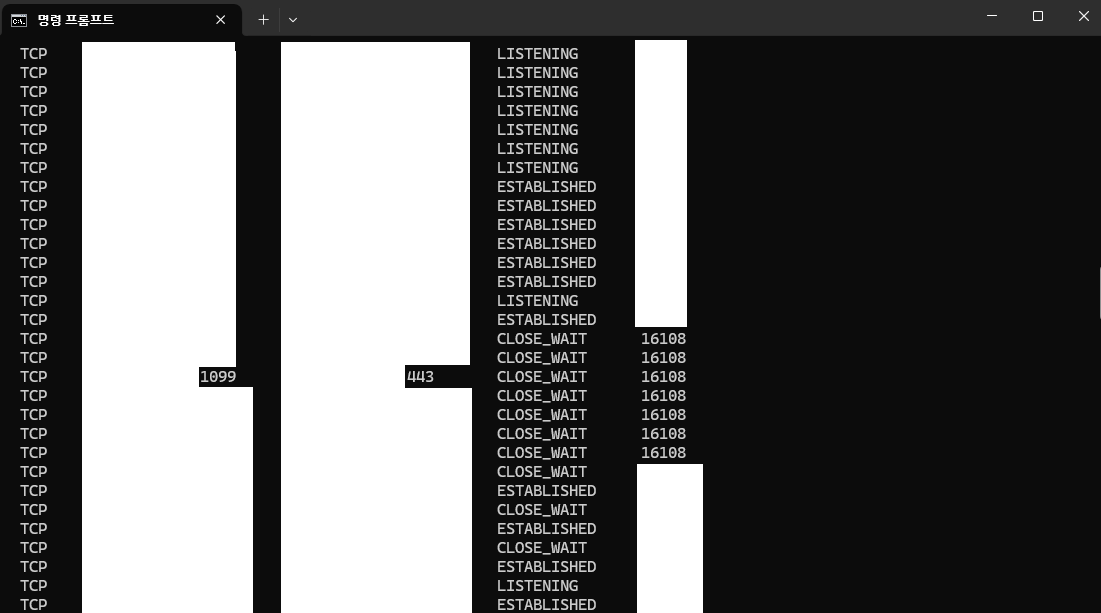 netstat -ano명령어를 통해 네트워크 연결 상태를 확인.