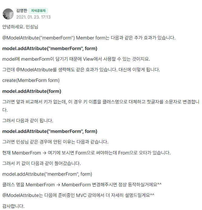 - Spring MVC가 메서드 파라미터에 있는 객체를 자동으로 Model에 추가해줌.