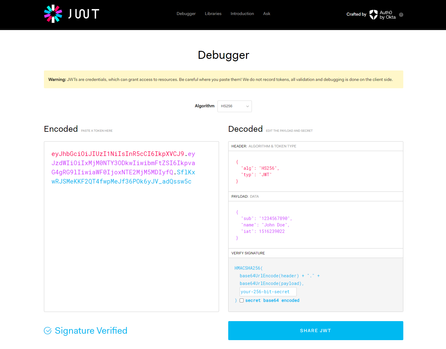 Base64로 인코딩된 헤더와 페이로드를 결합한 후 alg에 명시된 알고리즘과 비밀 키 또는 공개 키로 서명한 값.