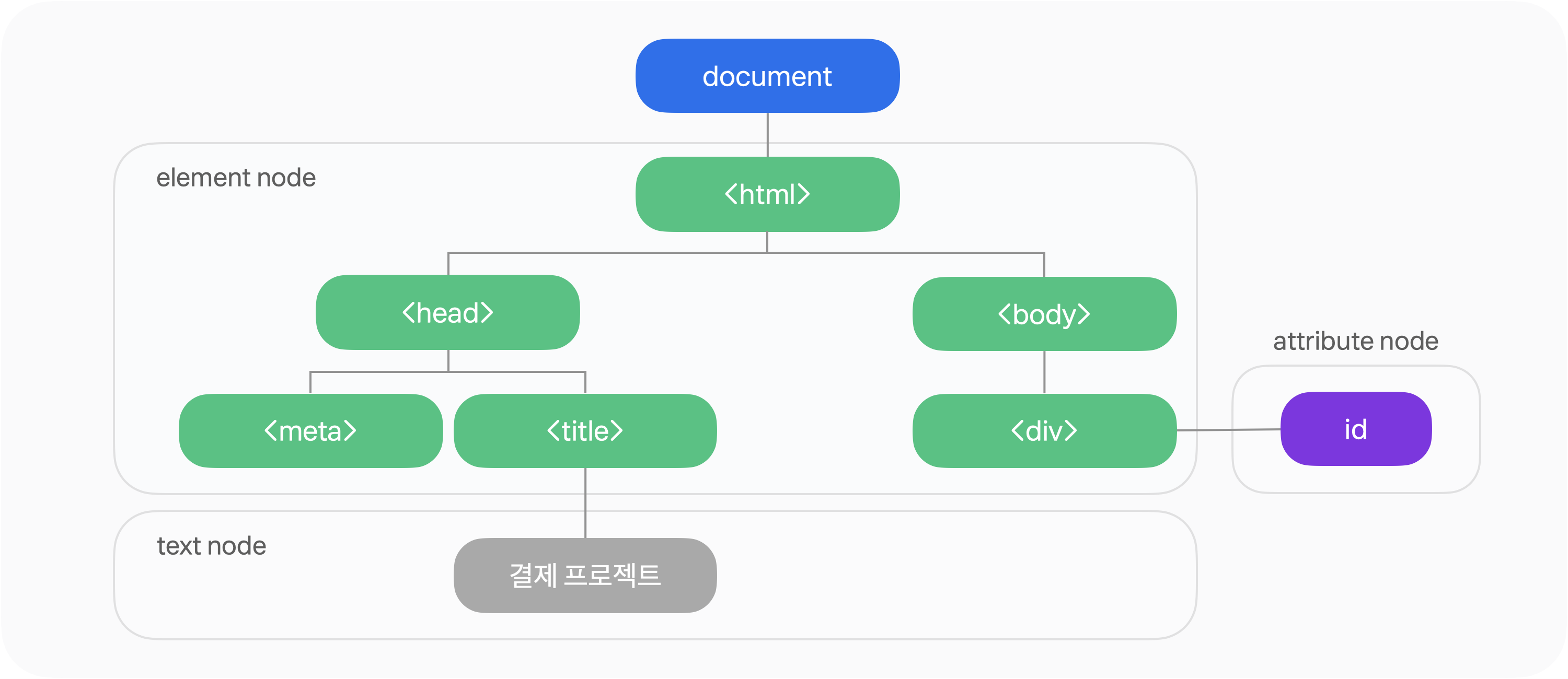 노드(node).루트(rood) 노드.부모(parent) 노드에는 자식(child) 노드가 있고, 부모 노드가 같은 형제(sibling) 노드도 있음.모든 HTML 태그는 요소(element) 노드임.텍스트 내용은 자식 노드인 텍스트(text) 노드임.속성은 자식 노드인 속성(attribute) 노드임.root element : html