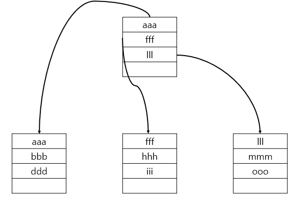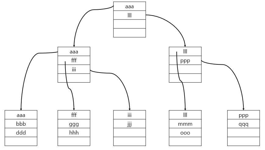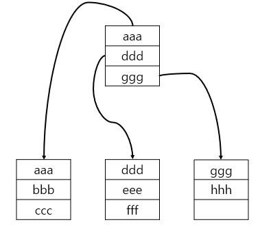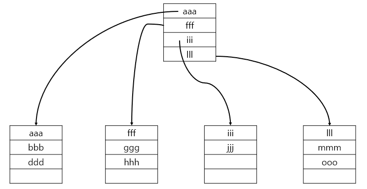 ↑ 트리 구조를 이루지 못하고 위 같은 상황에서 hhh까지 도달하려면3개 페이지의 데이터를 전부 조회해야 됨.전체 테이블 검색(Full Table Scan)이라고 함.