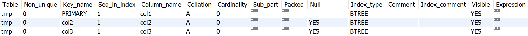 Key_name: PRIMARYPK를 통해 자동으로 생성된 인덱스. 즉, 클러스터 인덱스.Non_unique: 0 (False)!!UNIQUE = UNIQUE. 즉, 중복 허용 X.Column_name: col1CREATE TABLE tmp (