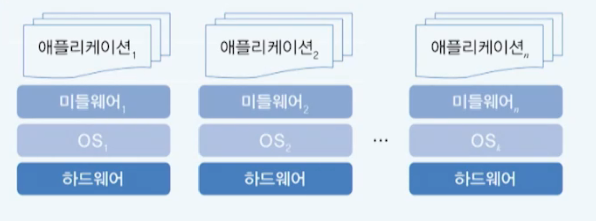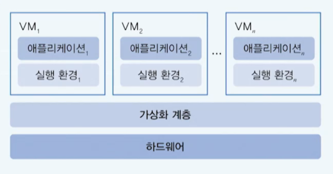 가상화 기술을 통해 H/W는 여러 개의 논리적 단위로 나뉠 수 있는데, 이 각각의 논리적 단위를 가상 머신(VM : Virtual Machine)라고 함.VM은 단순화된 펌웨어 같은 S/W의 일종으로 H/W 리소스를 OS가 아닌 VM 수준에서 제어하기 때문에 한 H/W상에서 각기 다른 종류의 OS를 여러 개 실행하는 것이 가능.가상화의 개념