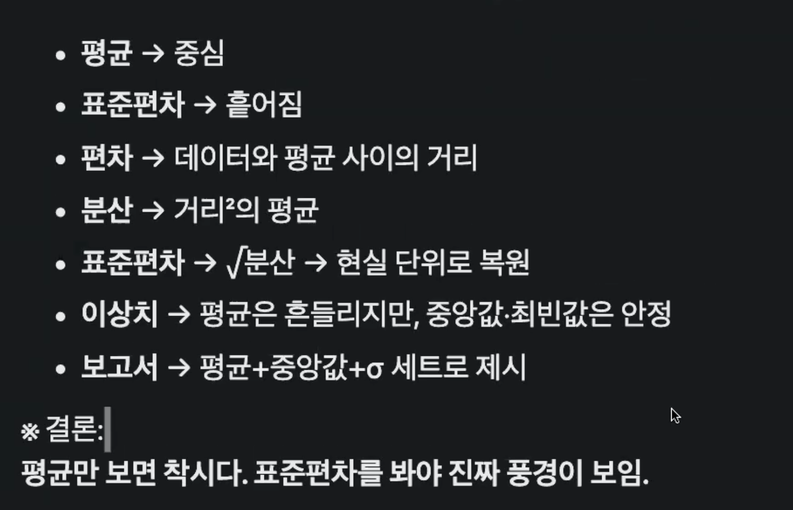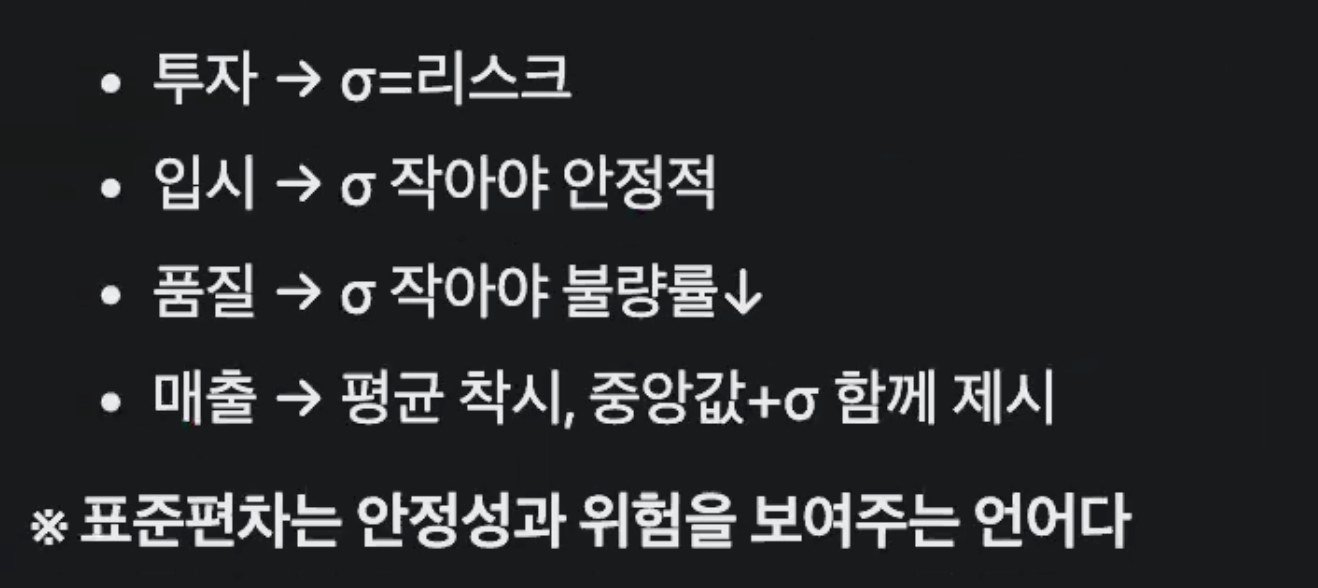 👉 평균은 같아도(A와 B 모두 30점), 선수 스타일이 안정적인지 폭발적인지 표준편차가 알려줌.