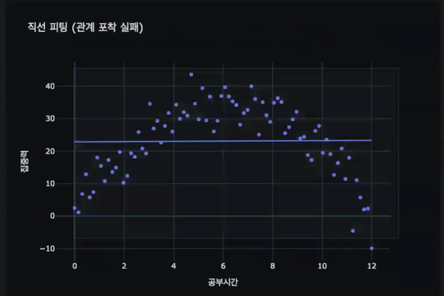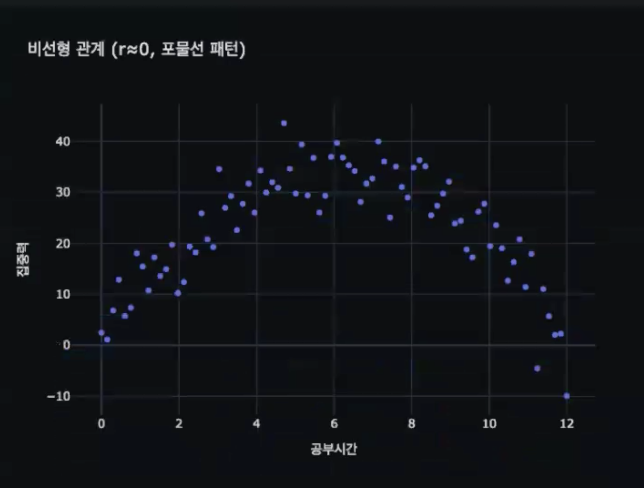 → 선형관계만 보면 "큰 상관 없음(r≈0)"처럼 나오지만, 실제론 곡선(∩) 관계