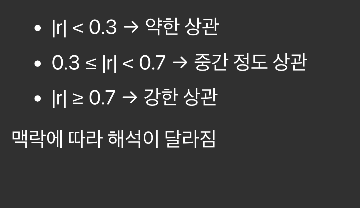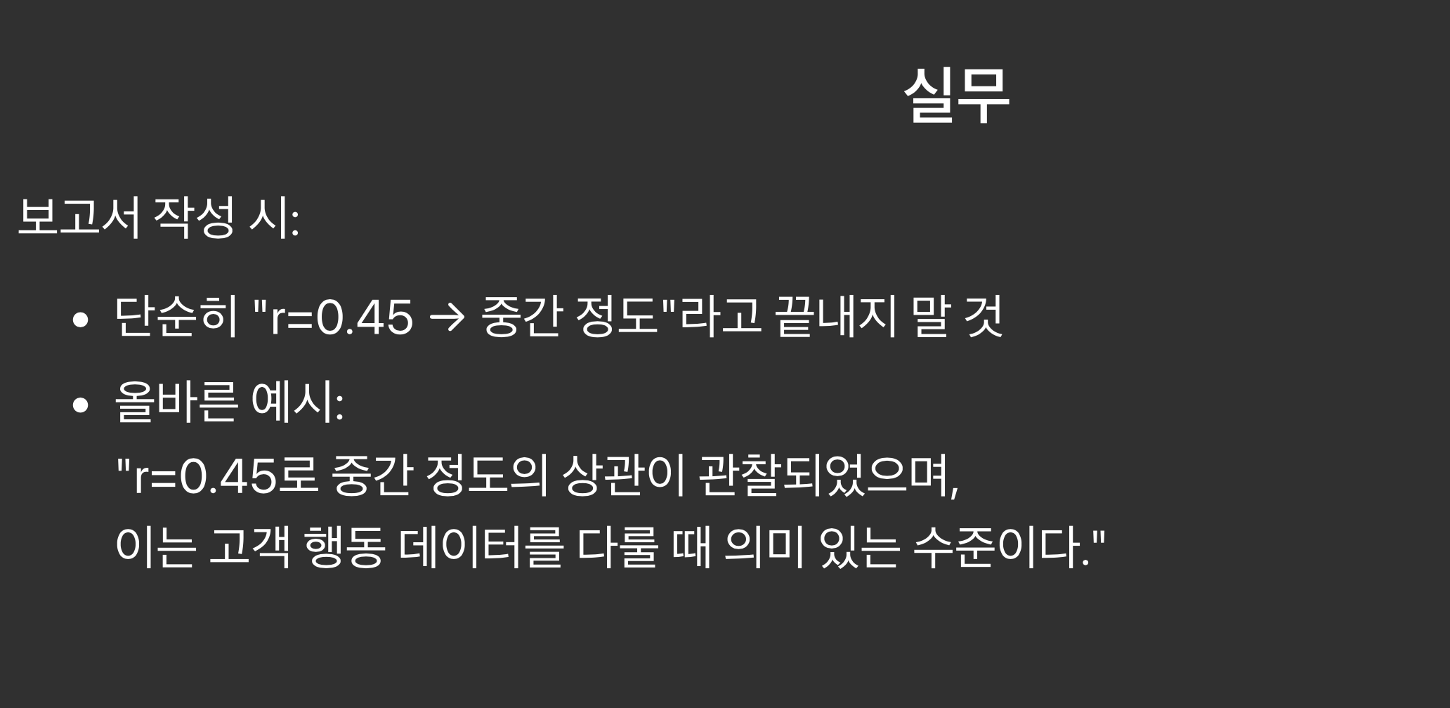 교육 연구에서 “공부 시간과 시험 점수” r = 0.35 → 꽤 중요한 상관관계로 간주.