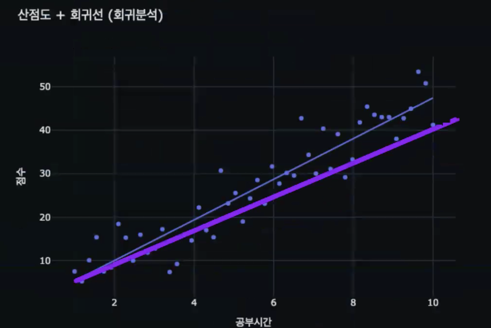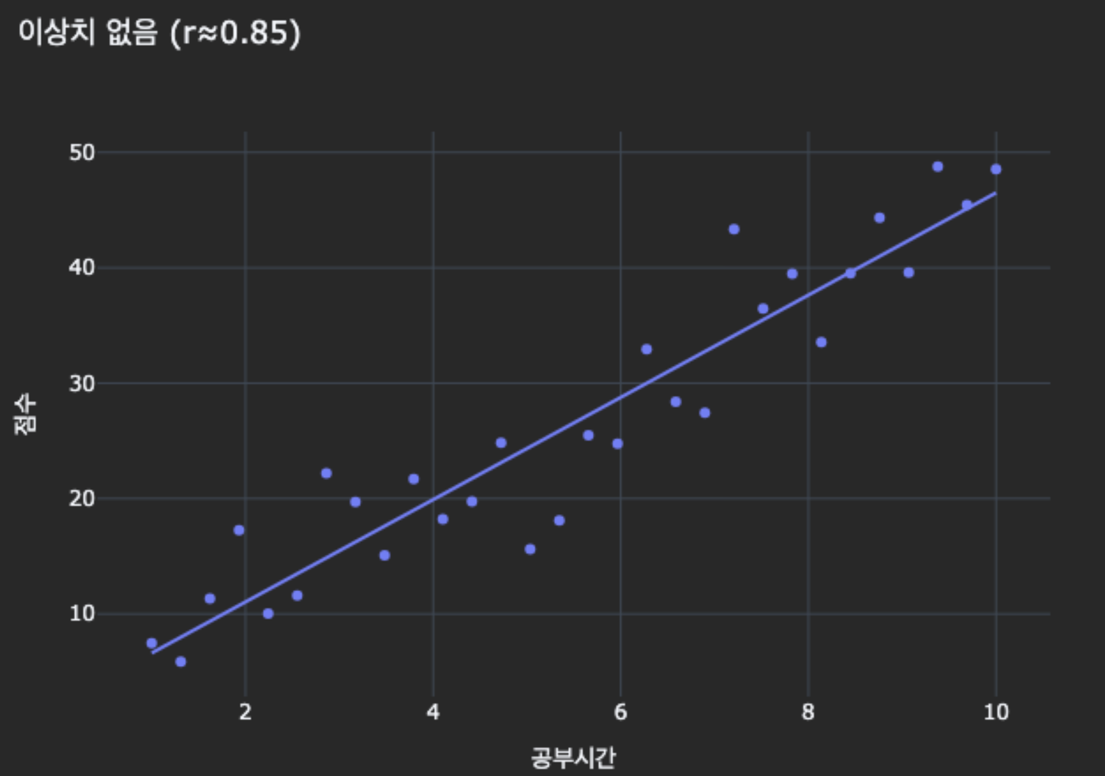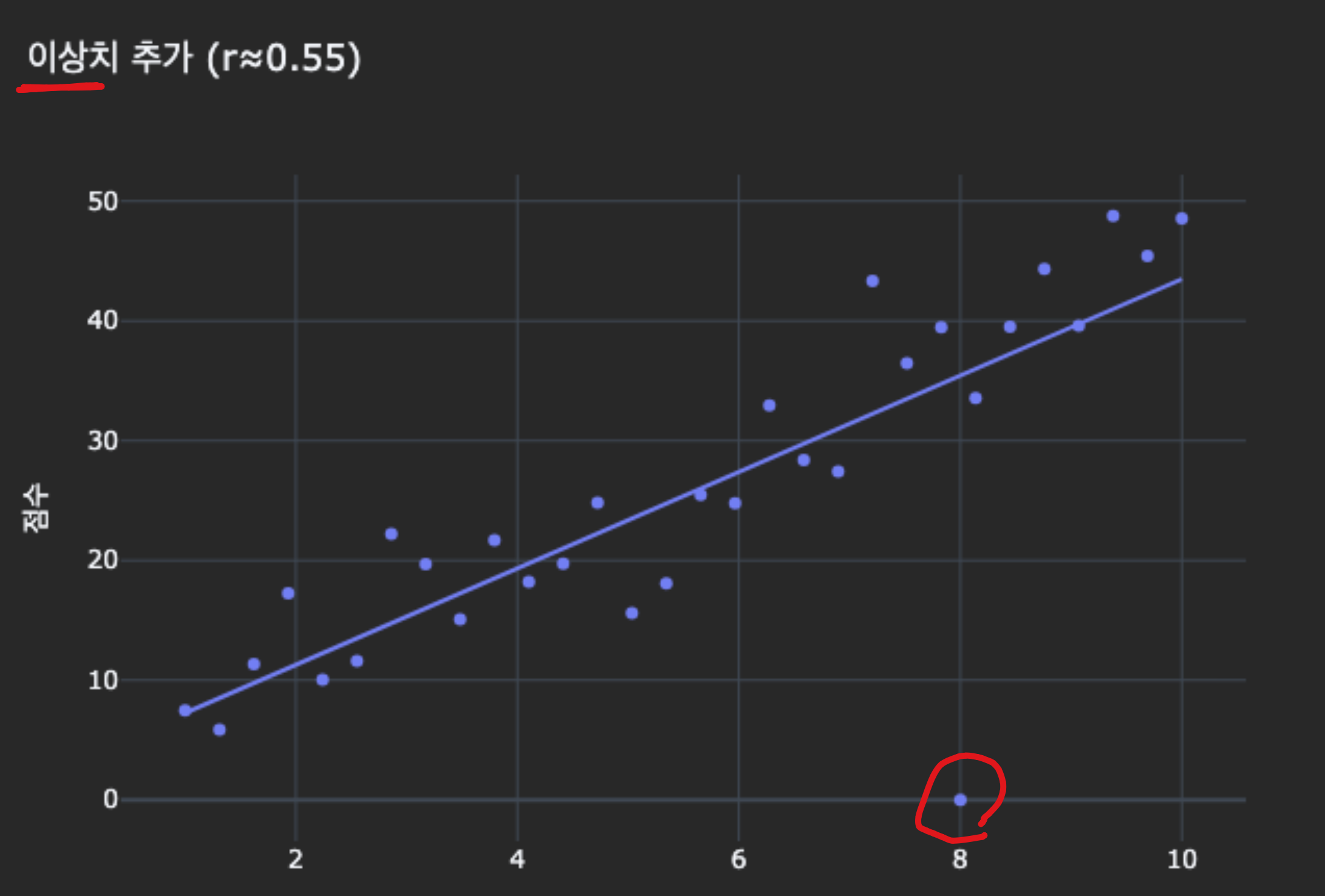 하지만 개별 점을 찍어보면 “많이 공부한 애들은 점수가 오르는 추세”가 보일 수 있음.