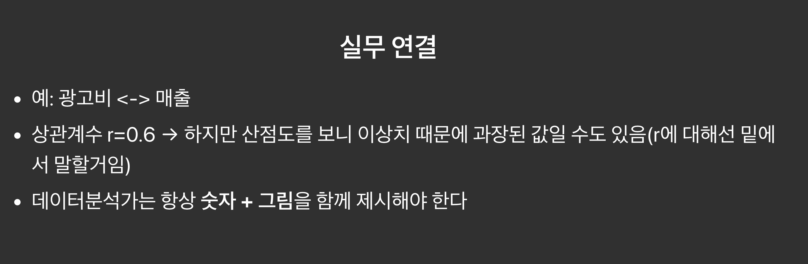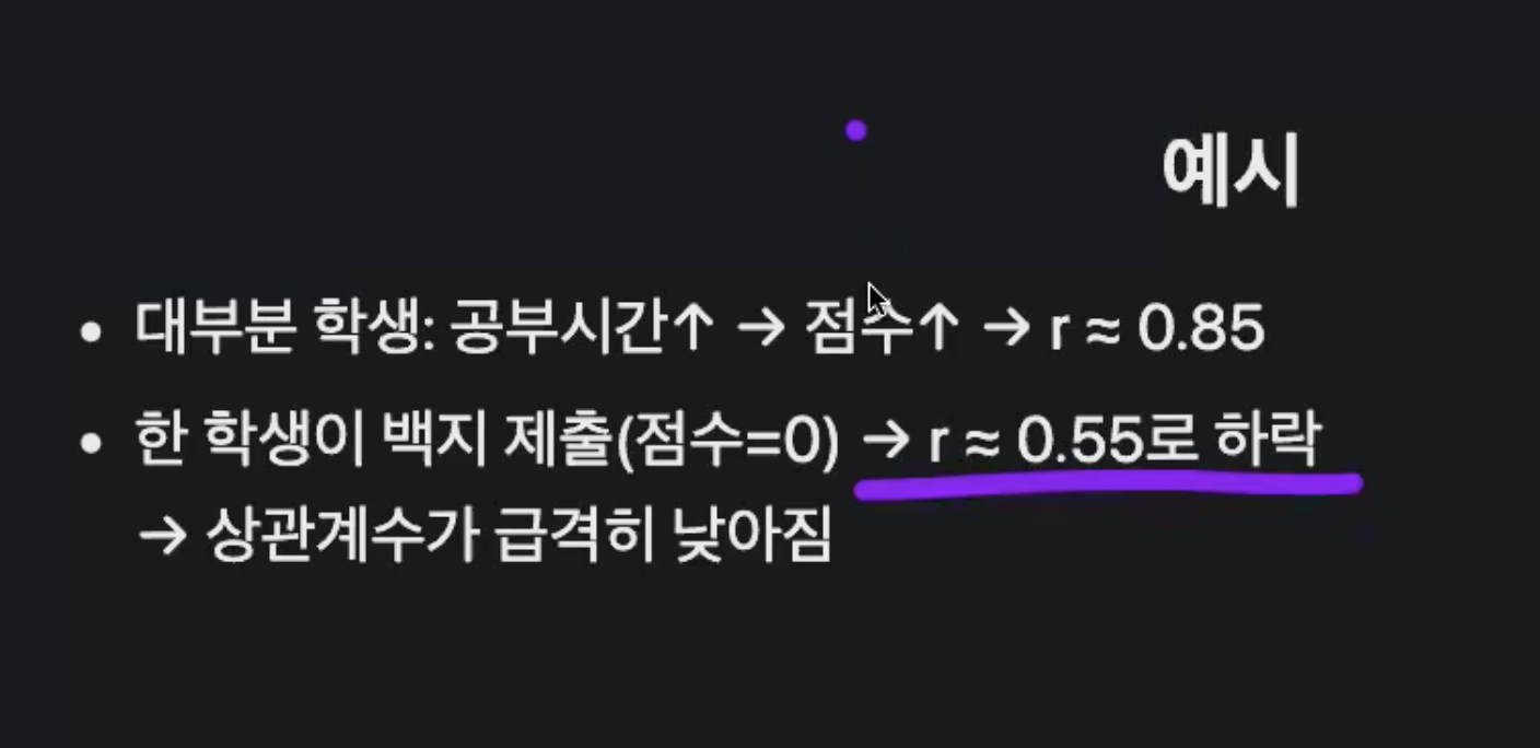 전체적인 경향을 벗어나는 일부 이상치 데이터는 상관관계의 해석을 크게 바꿀 수 있음.