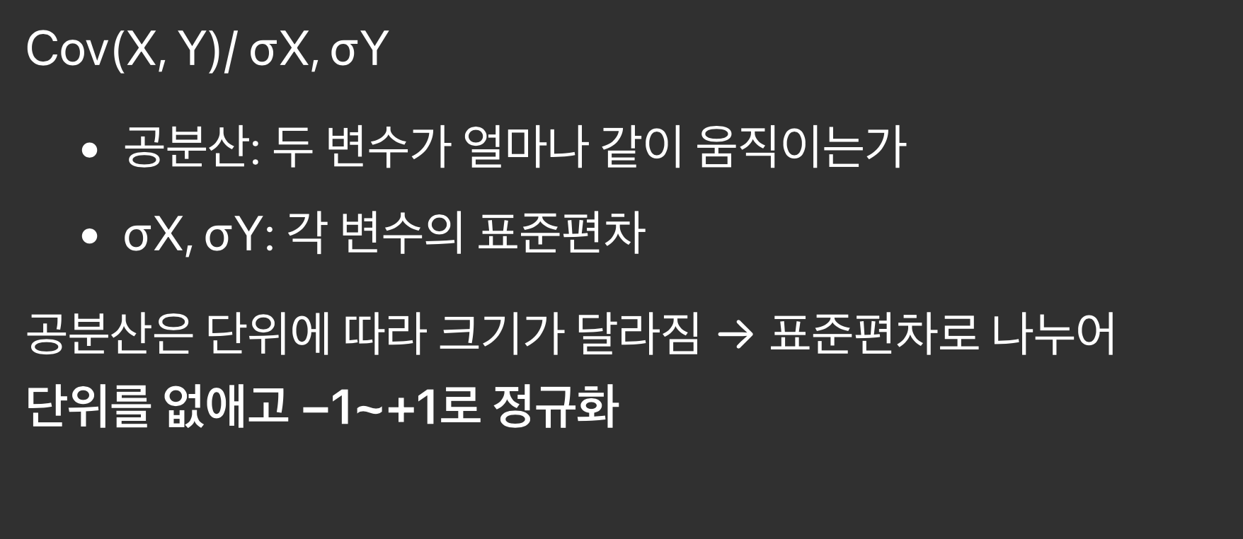 산점도: 두 변수의 관계(양/음의 상관, 선형/비선형)를 눈으로 바로 확인 가능.
