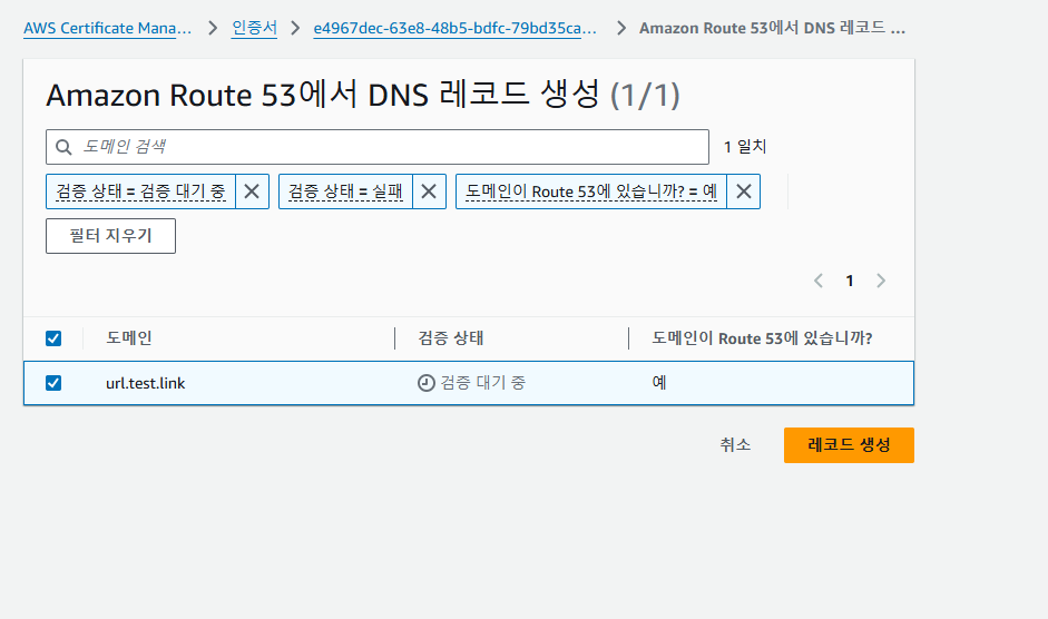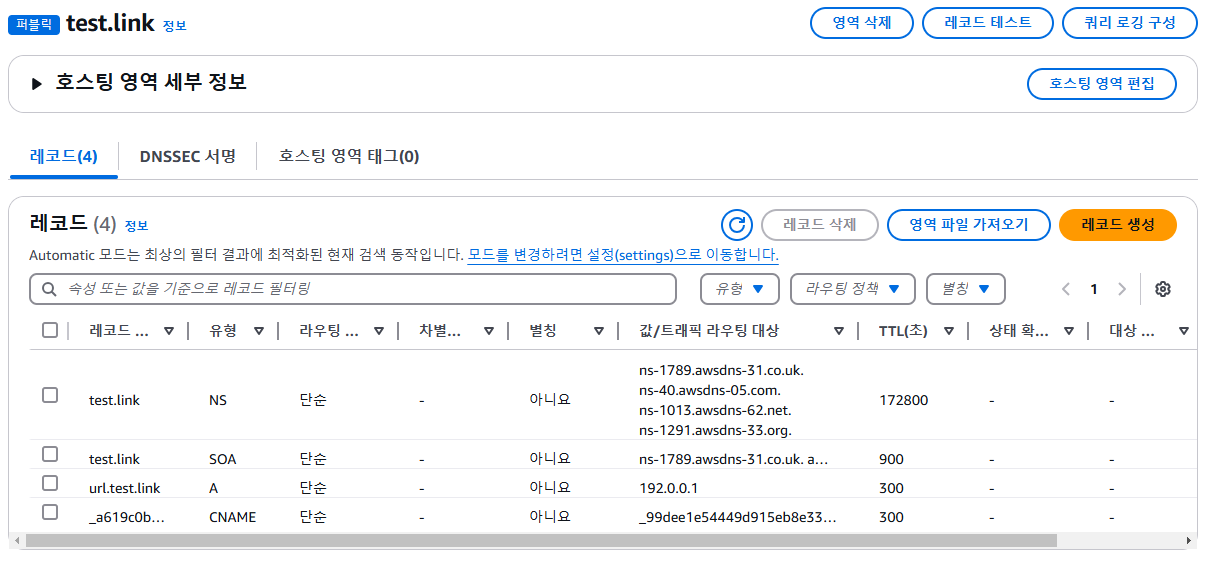 url.test.link의 라우팅 대상 IP는 임의로 생성한 것이다, 여기서 알 수 있는점은 실제로 도메인이 존재하지 않고 ECS 및 EC2가 존재하지 않아도 인증서 전용 레코드를 만들 수 있다는 점이다.
