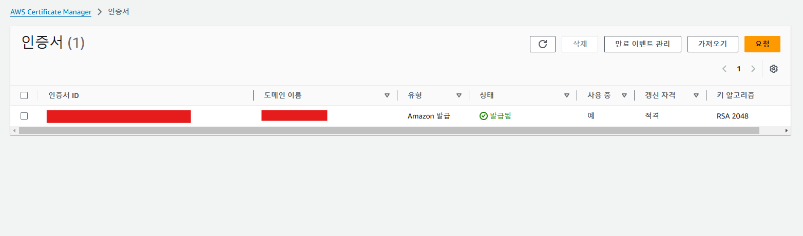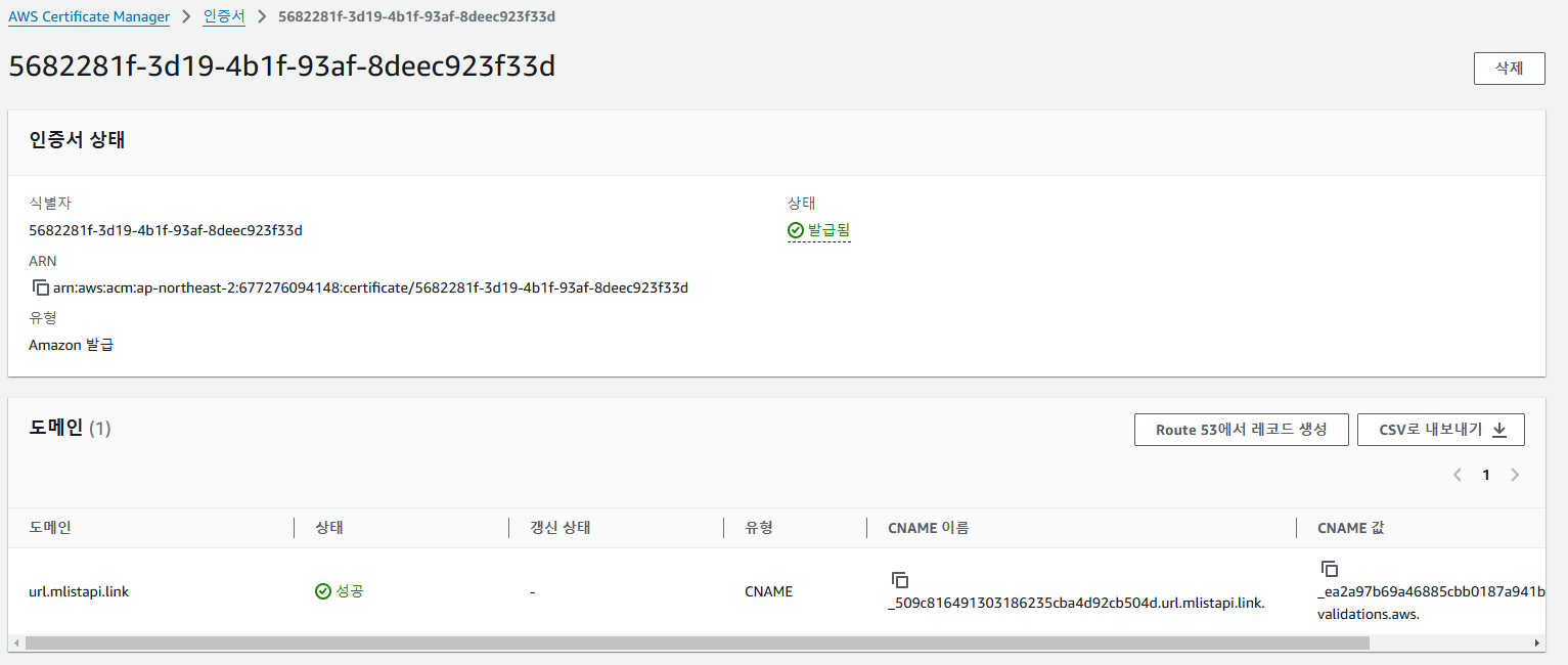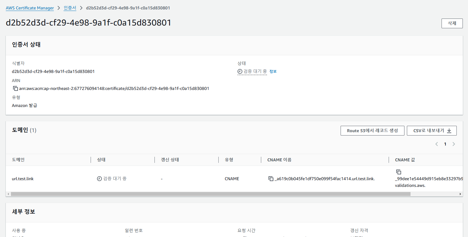 인증서를 발급 받으면 이처럼 상태가 발급됨으로 되어있는 것을 확인 할 수 있다. 원래는 실제로 등록된 도메인으로 DNS 및 레코드를 만들었고 그 호스팅 영역에 CNAME레코드를 만들었다면 몇 분내로 인증서를 발급 받을 수 있지만 도메인이 존재하지 않는 DNS에 레코드를 만들면 인증서를 발급 받을 수 없다.