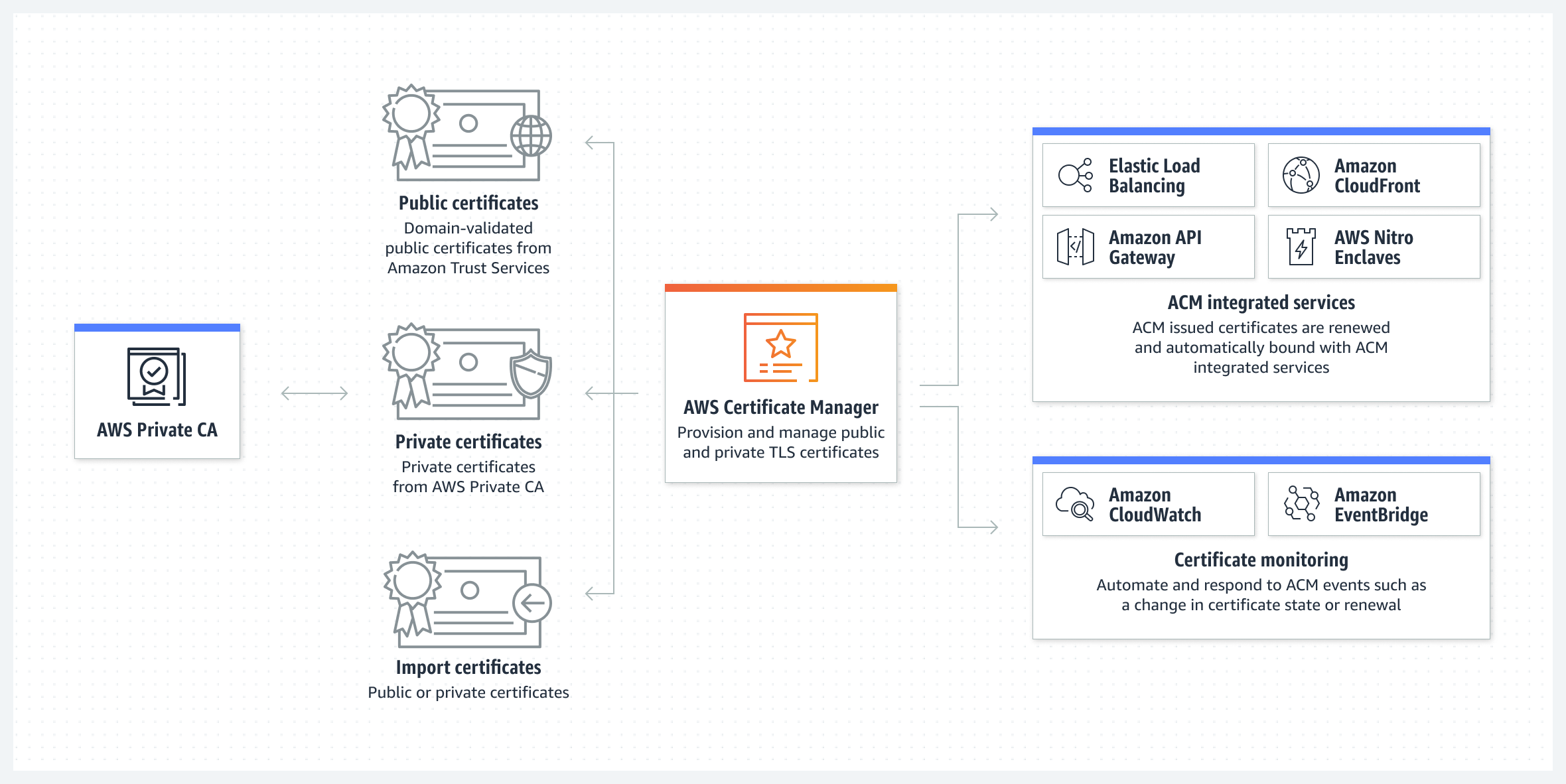 ACM에서 직접 발급하거나 서드 파티 인증서를 ACM 관리 시스템으로 가져오는 방법으로 통합 AWS 서비스에 대한 인증서를 제공할 수 있다.