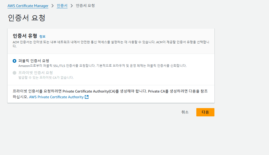 기본 인증서인 퍼블릭 인증 요청으로 한다.