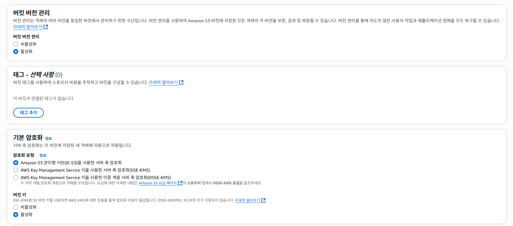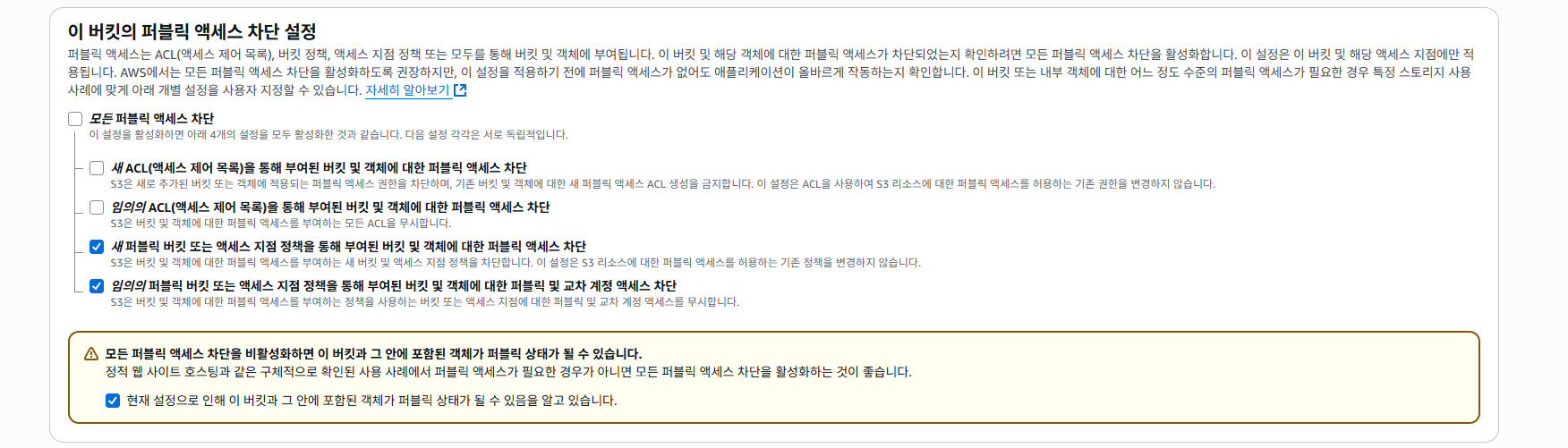만약 데이터가 중요도가 낮다면 퍼블릭 액세스를 차단하지 않아도 상관 없습니다. 하지만 뒤에서 설정할 IAM에서 허용한 사용자만 이미지를 입력하도록 하기위해 다음과 같이 설정합니다.