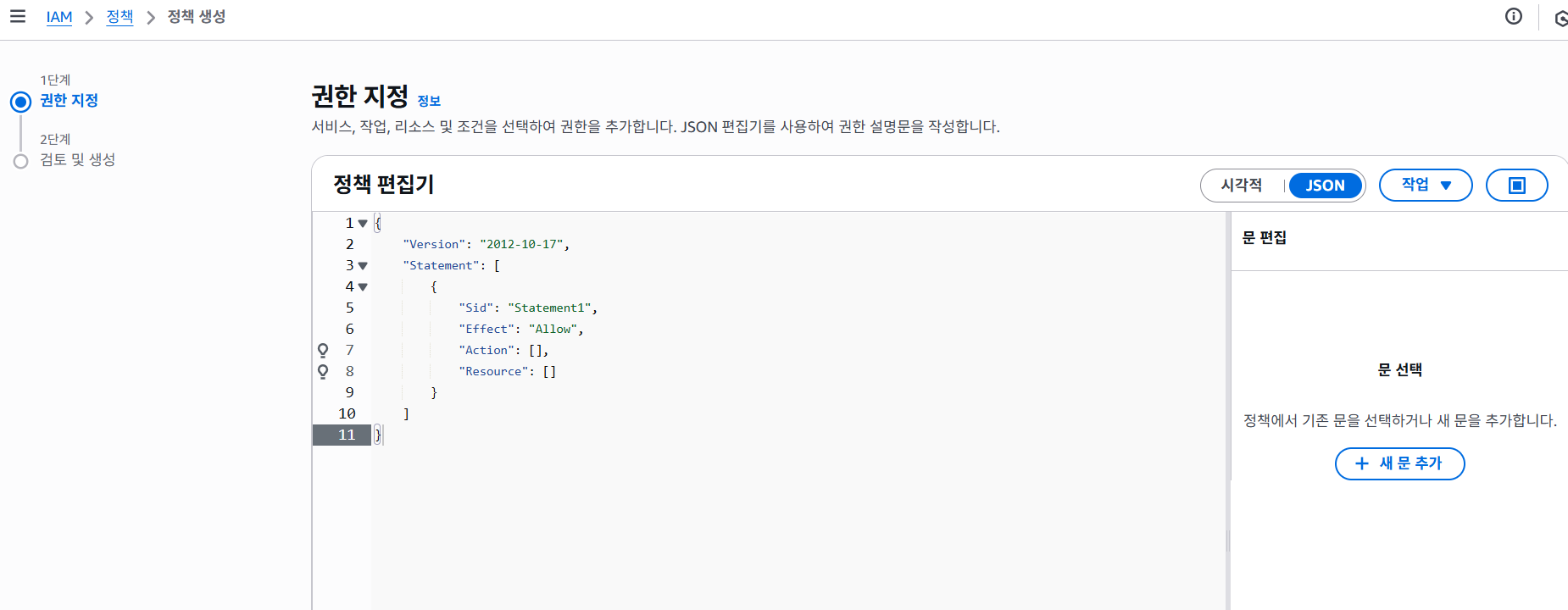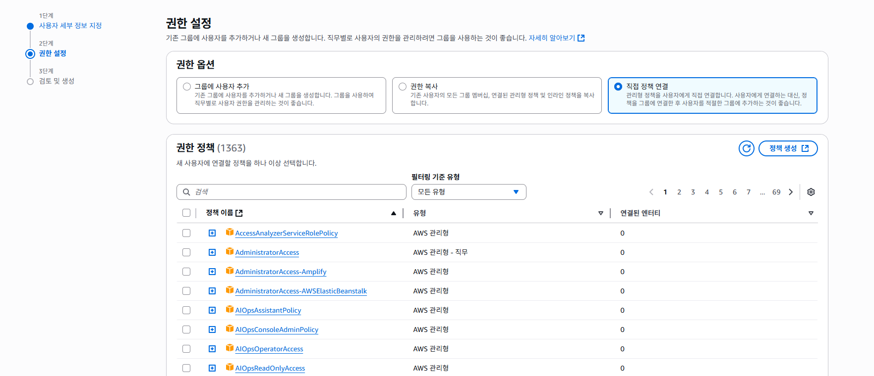 권한을 설정하는데 2가지 방법이 있습니다. AWS에서 제공하는 권한 정책을 사용하거나 아니면 직접 정책을 생성하는 방법 이렇게 2가지가 있습니다.