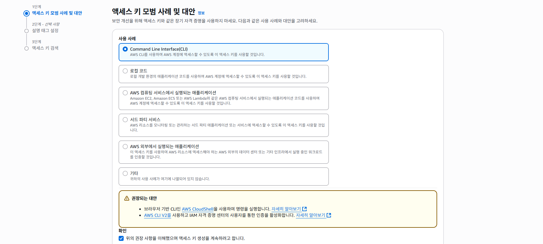 실제로 S3에 업로드를 하기위해서는 액세스 키가 필요합니다. 첫 번째로 액세스 키 대안을 선택해야하는데 위의 이미지처럼 맨 처음 사례를 선택하고 확인 부분을 체크 합니다.