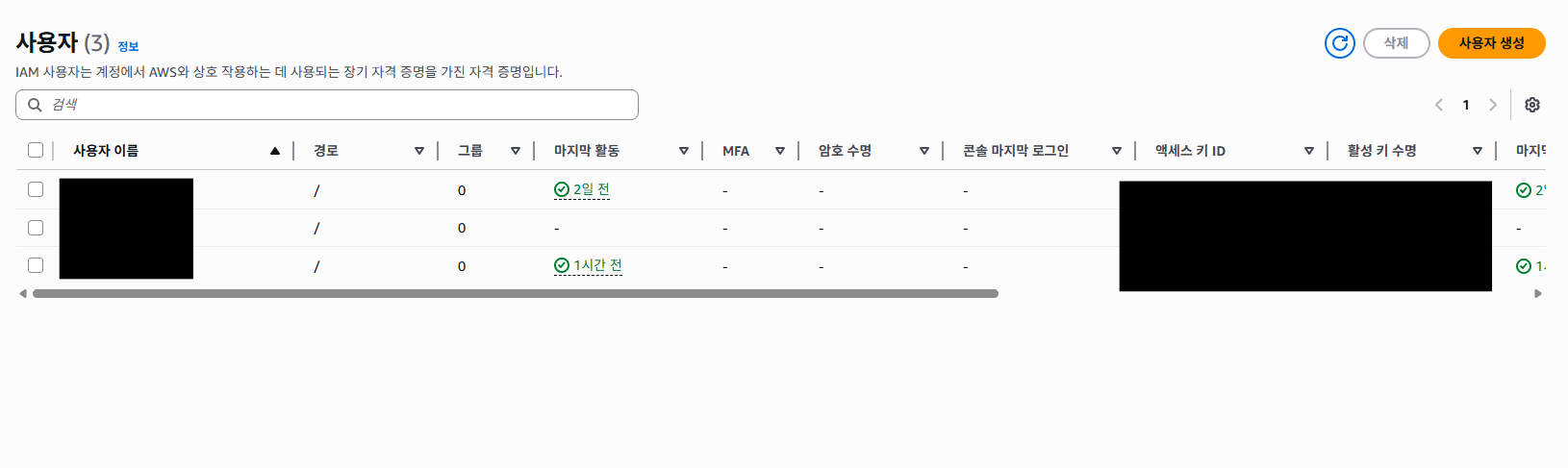 (액세스 키의 secret을 분실하면 다시 확인이 불가능하나 액세스 키는 추가적으로 생성이 가능합니다.)